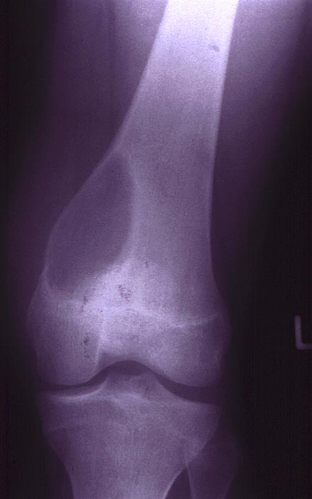 Radiologisch erkennt man in der distalen linken Femurmetaphyse medial eine exzentrisch gelegene Osteolysezone, die mediodorsal zu einer schalenartigen Ausbeulung des Knochens mit Bildung einer Neokortikalis geführt hat. Besonders nach dorsal ist die Neokortikalis sehr dünn.