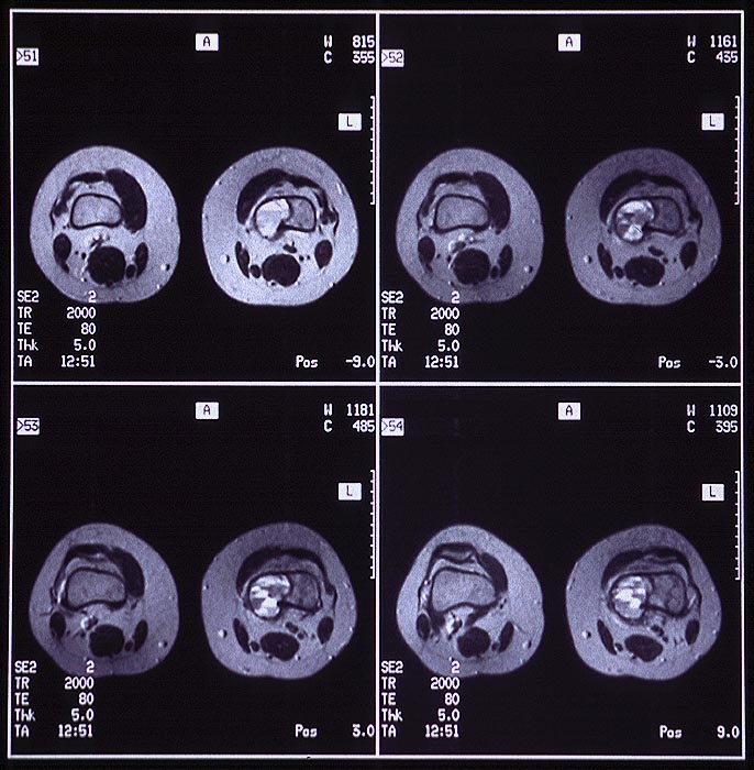 MRT: In der distalen linken Femurmetaphyse medial eine exzentrisch gelegene mehrkammrige Zyste. Im Kernspintomogramm erkennt man bei starker T2-Gewichtung Flüssigkeitsspiegel.
