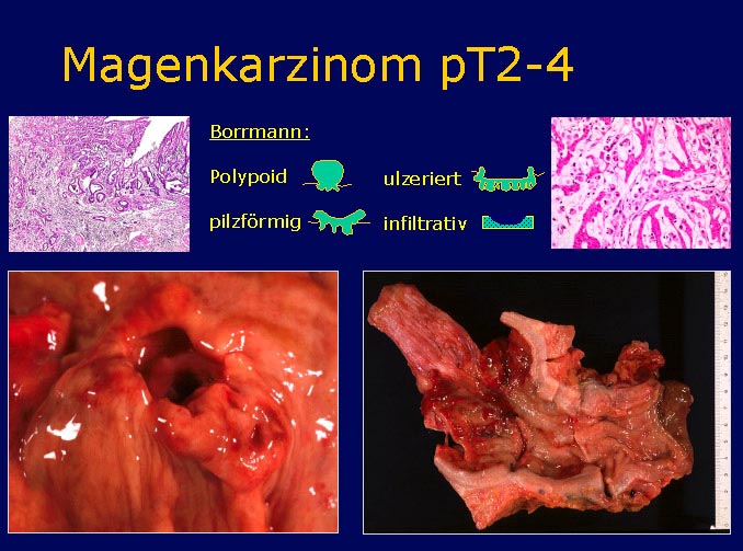 Nach ihrem makroskopischen Erscheinungsbild werden fortgeschrittene Magenkarzinome nach Borrmann in vier Typen eingeteilt. Polypoide und pilzförmig ulzerierte Tumoren entsprechen histologisch meist einem intestialen Typ nach Lauren (linke Bildhälfte). Ulzerierte Tumoren mit unscharfem Rand und infiltrative Tumoren (Linitis plastica) entsprechen histologisch meist dem diffusen Typ nach Lauren (rechte Bildhälfte).