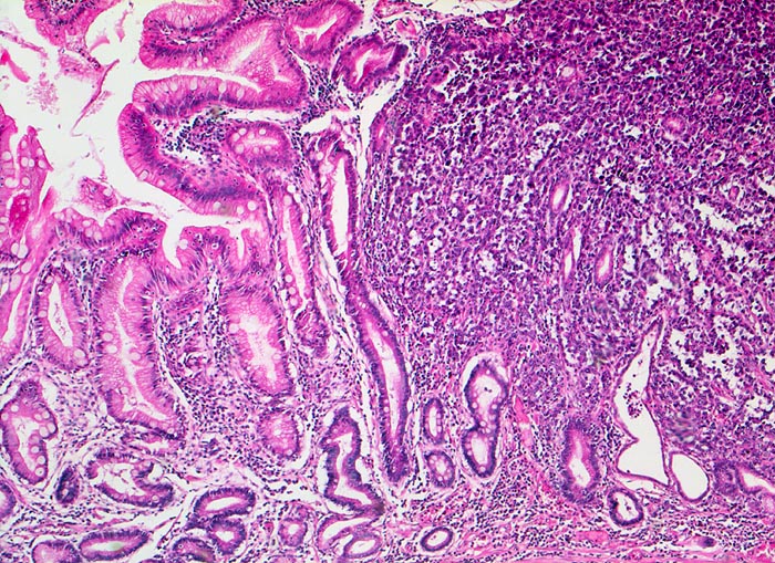 Links im Bild die Magenschleimhaut mit intestinaler Metaplasie (zahlreiche Becherzellen). Diffuse Tumorinfiltration mit Verdrängung und Umwachsung der ortsständigen Magendrüsen rechts im Bild. Der abgebildete Karzinomanteil ist gering differenziert. Die hochgradig atypischen Tumorzellen bilden nur andeutungsweise erkennbare Drüsenschläuche.