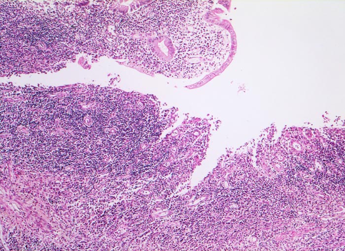 Verplumpung der entzündlich infiltrierten Dünndarmzotten.