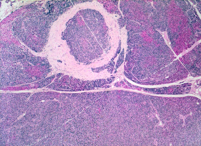 Bei der nodulären Hyperplasie sind alle Nebenschilddrüsen knotig vergrössert. Im Gegensatz zur Hyperplasie manifestieren sich Adenome der Nebenschilddrüse meistens als solitäre bekapselte Knoten. Im Randbereich von Adenomen findet man in 50% der Fälle nicht neoplastisches supprimiertes (atrophes) Nebenschilddrüsengewebe mit reichlich Fettzellen und verkleinerten Hauptzellen.
