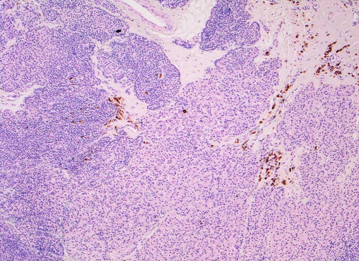 Das Gewebe ist knotig strukturiert und enthält keine Fettzellen. In den Bindegewebssepten sind braun gefärbte Zellen nachweisbar, die siderinbeladenen Makrophagen entsprechen.