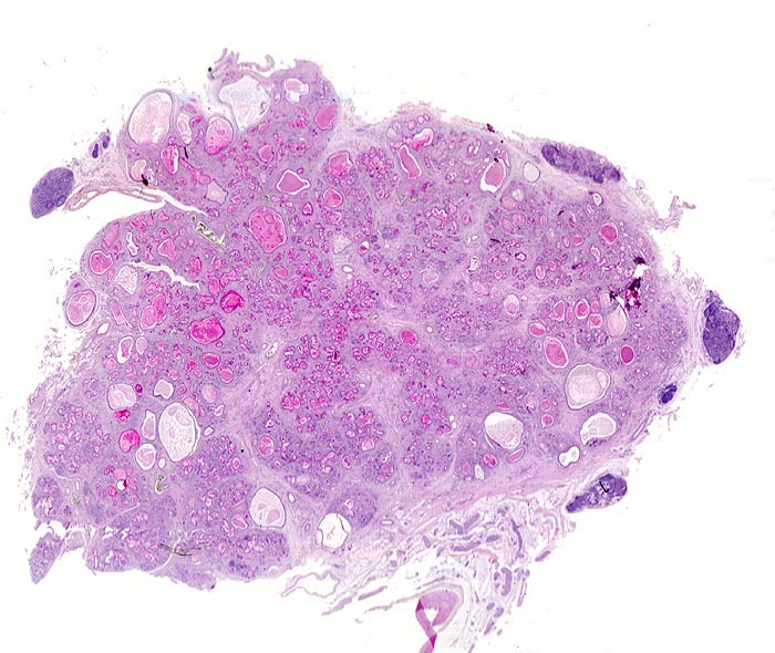 Neben einer mässig ausgeprägten Fibrose fallen in der Übersicht vor allem die zahlreichen dilatierten und mit eingedicktem PAS positivem Schleim angefüllten Gänge auf. Die dunkelblauen Knoten im peripankreatischen Gewebe entsprechen dort üblicherweise vorhandenem lymphatischem Gewebe.