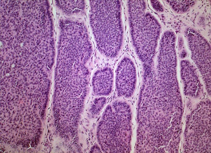 Der Tumor besteht aus soliden Platten aus basaloiden Zellen. Die Zellen am Rand der soliden Zellplatten sind parallel und senkrecht zur Basalmembran ausgerichtet ( Palisadierung). Zwischen den Zellplatten und dem Stroma findet sich stellenweise ein typischer Retraktionsartefakt.