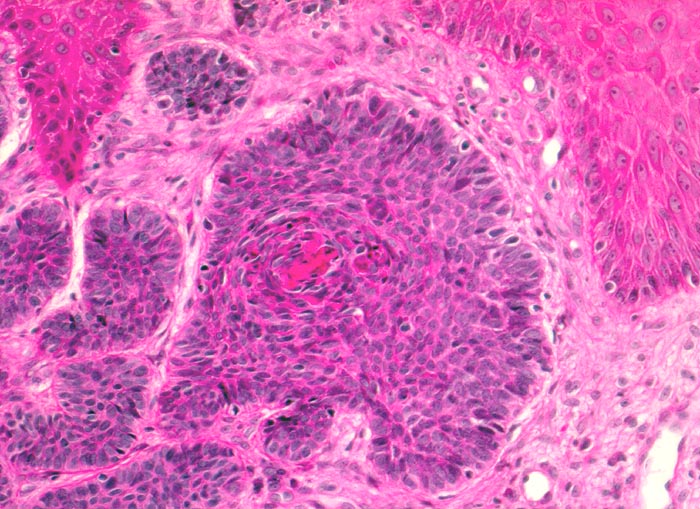 Verhornung. Die zytoplasmaarmen Tumorzellen sehen sehr ähnlich aus wie die