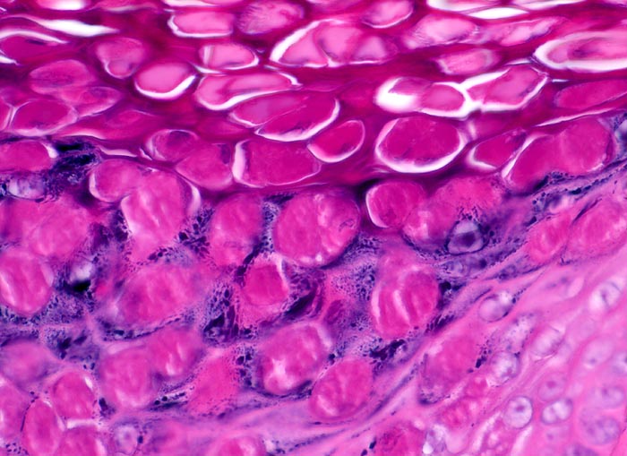 Oben im Bild das Stratum corneum. Darunter die Zellen des Stratum granulosum mit blauen Keratohyalingranula im Zytoplasma. Das Molluscum Körperchen ist das Ergebnis einer viral induzierten zytopathischen Zytoplasmareaktion. Die eosinophilen intrazytoplasmatischen Einschlüsse enthalten Viruspartikel. Die Viruspartikel werden grösser in Richtung Granularzellschicht und Stratum corneum. Durch die intrazytoplasmatischen Einschlusskörper wird der Zellkern zur Seite gedrängt.