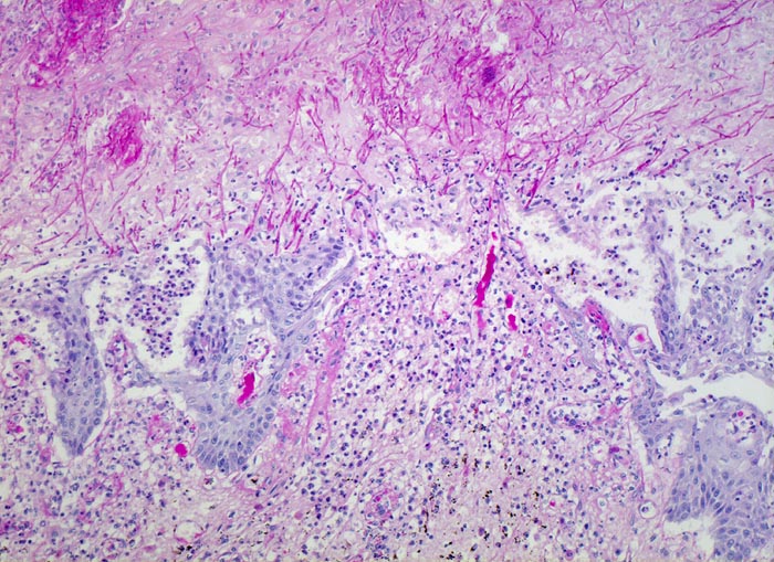Das Plattenepithel ist teils ulzeriert, teils erodiert. Soorpseudohyphen infiltrieren das stehengebliebene Epithel. Dichte Infiltrate von neutrophilen Granulozyten im Epithel.
