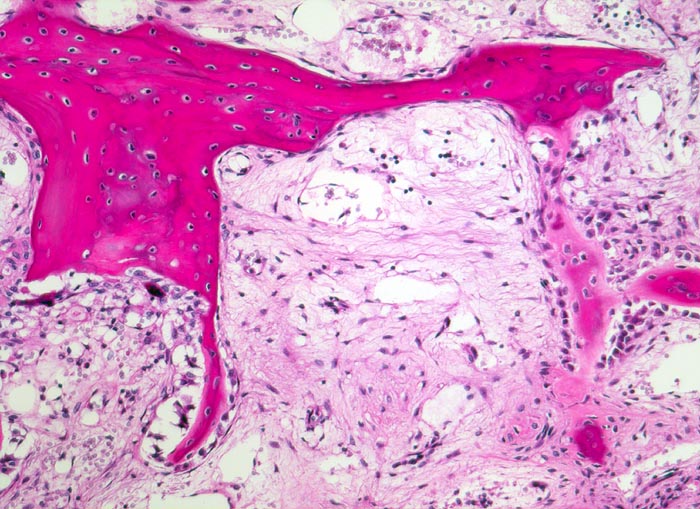 Remodelling des neugebildeten Faserknochens im Bereich des Frakturkallus. Während ein Teil des Knochens durch Osteoklasten abgebaut wird, bauen gleichzeitig Osteoblasten an anderer Stelle neuen Knochen auf. Zwischen den Knochenbälkchen lockeres Granulationsgewebe.