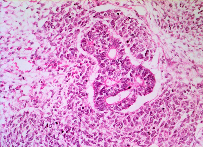 Komplexe kribriforme epitheliale Strukturen innerhalb des zellreichen Blastems.