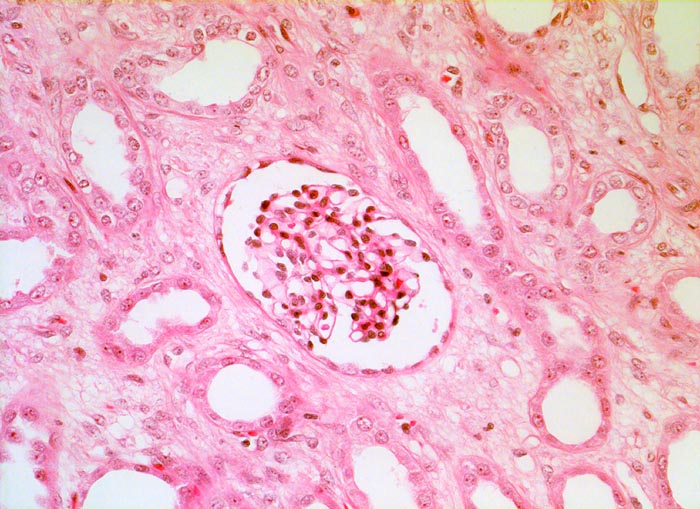 Podozyten mit grossen Kernen. Weitgehend infiltratfreier tubulointerstitieller Raum.