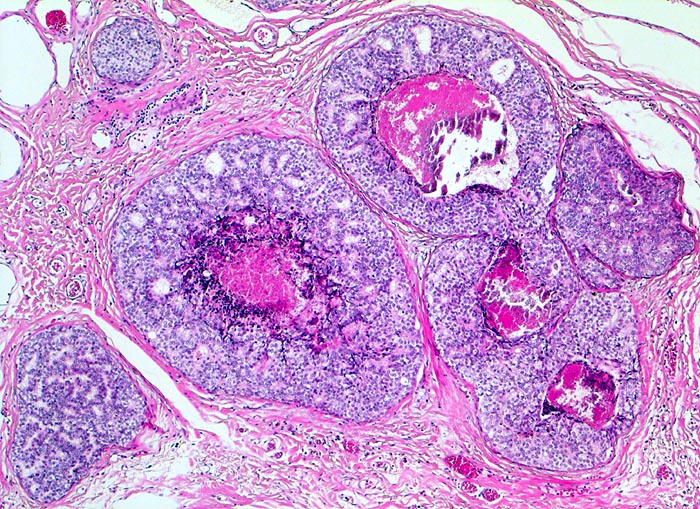 Kribriformes duktales in situ Karzinom mit zentralen, teils verkalkten Komedonekrosen, zytologisch non high grade (deshalb kein Komedokarzinom). Das Tumorgewebe wächst rein intraduktal und ist von einer Basalmembran umgeben.