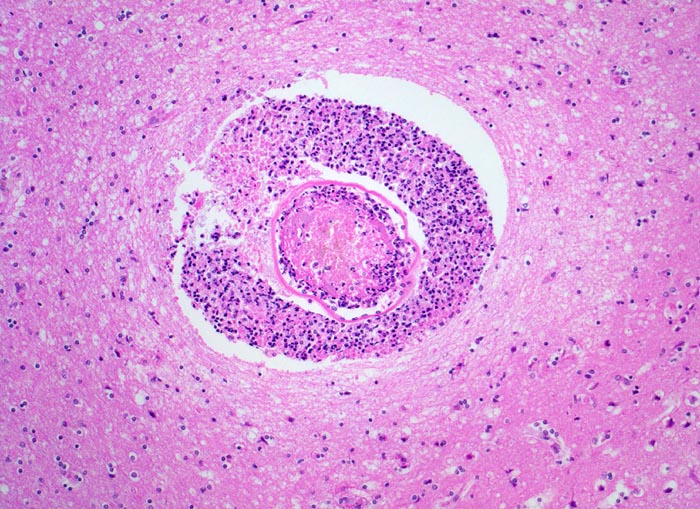 Leptomeningeales Gefäss gefüllt mit neutrophilen Granulozyten und Fibrin im Bildzentrum. Der angrenzende Subarachnoidalraum ist ebenfalls mit Eiter angefüllt.