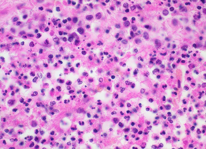 Ausschnitt aus dem eitergefüllten Subarachnoidalraum: Wenig Fibrin, segmentkernige und stabkernige neutrophile Granulozyten, Kerntrümmer von zerfallenen neutrophilen Granulozyten.
