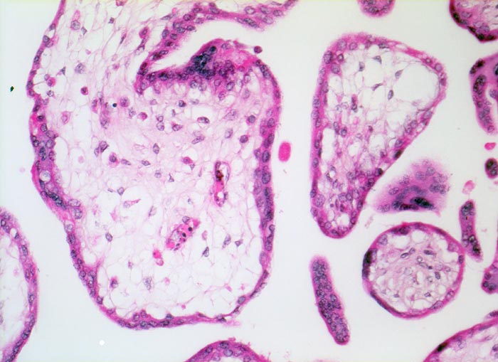 Plazentarzotte aus der 11. Schwangerschaftswoche mit lockerem Stroma und kleinen Gefässen. Diese enthalten überwiegend kernlose, aber zu diesem Zeitpunkt der Schwangerschaft auch noch einzelne kernhaltige Erythrozyten. Einschichtiger Zytotrophoblast. Syncytiotrophoblast.