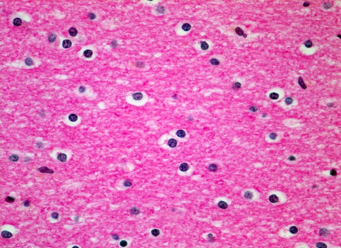 Oligodentrozyten haben einen kleinen dichten runden Kern und sind umgeben von einem weissen Halo (Schrumpfungsartefakt).