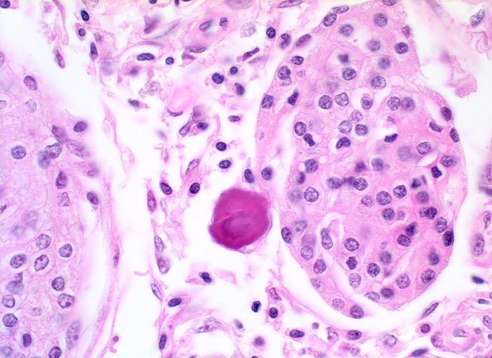 Psammomkörperchen kommen typischerweise in Meningeomen vor, sind aber beim meningothelialen Subtyp nur spärlich anzutreffen.