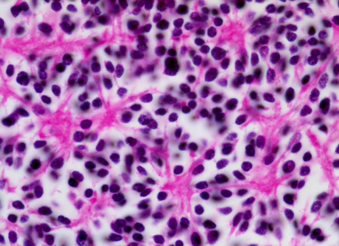 Dicht gepackte Zellen mit ovalen oder karottenförmigen stark hyperchromatischen Kernen umgeben von wenig Zytoplasma. Typische Homer-Wright Rosetten: Diese bestehen aus ringförmig angeordneten Tumorzellkernen um ein fibrilläres Zentrum aus Zytoplasmafortsätzen.