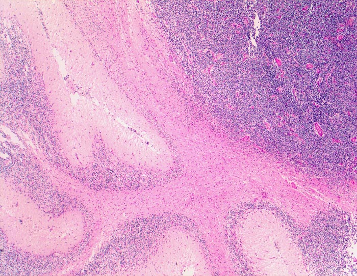 Angrenzend an die Kleinhirnrinde links im Bild scharf begrenzter sehr zellreicher