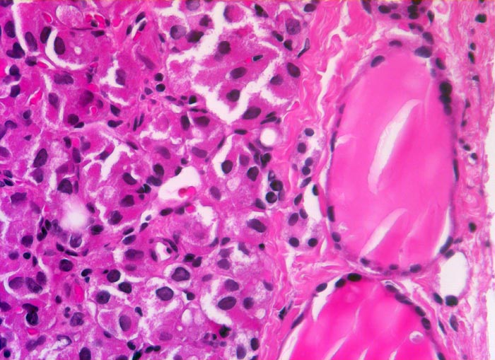 Seit zirka 10 Jahren ist beim Patienten eine Struma bekannt. Jetzt sucht er den Hausarzt auf, weil er den Eindruck hat, die Schilddrüse sei grösser geworden. In der Ultraschall-Untersuchung wird ein Knoten im rechten Schilddrüsenlappen festgestellt, der relativ scharf vom angrenzenden Gewebe abgesetzt ist. Die Feinnadelpunktion ergibt eine follikuläre Neoplasie; eine Unterscheidung zwischen einem follikulären Adenom und einem follikulären Karzinom ist zytologisch jedoch nicht möglich. Es wird eine Hemithyreoidektomie durchgeführt und nach der Diagnosestellung eines follikulären Karzinoms eine Resthyreoidektomie angeschlossen.