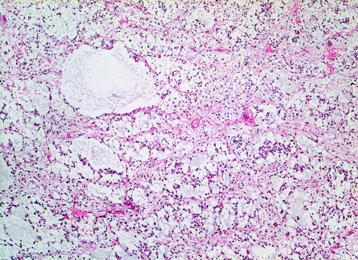 Fokale mukoide/zystische Degeneration innerhalb des Tumors mit Ausbildung von