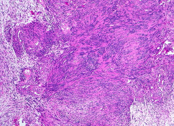Biphasischer Tumor mit kompakten spindelzelligen parallel ausgerichteten dunkleren Tumorzellverbänden ( Antoni A Muster) und lockeren, hellen Zellverbänden ( Antoni B Muster).