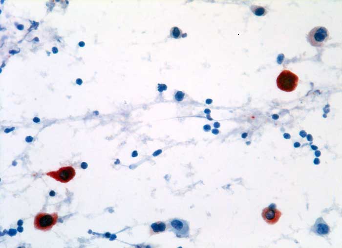 Transbronchiales Feinnadelpunktat der Lunge, rechts hilär: Zahlreiche Zellen eines wenig differenzierten nicht-kleinzelligen Karzinoms. Die Tumorzellen reagieren mässig stark bis stark positiv mit dem Marker Hep-Par 1 (Hepatocyte)