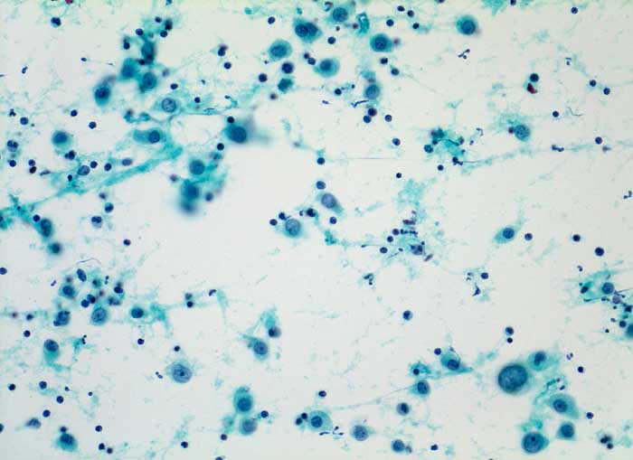 Transbronchiales Feinnadelpunktat der Lunge, rechts hilär: Grosse, zytoplasmareiche, teils mehrkernige Tumorzellen mit prominenten Nukleolen.