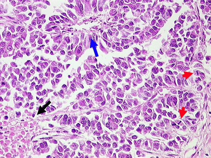 ► Mittelgrosse Tumorzellen mit reichlich Zytoplasma und zahlreichen Mitosen. ► Herdförmige Nekrosen. ► Pseudorosettenbildung um Gefäss.