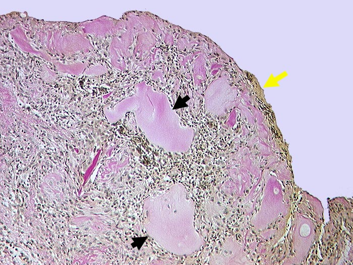 Fibrosierte Synovialis mit geringen ► Fibrinauflagerungen und avitalen Knochenfragmenten und ► Knorpelfragmenten umgeben von einem lockeren mononukleären Entzündungsinfiltrat.
