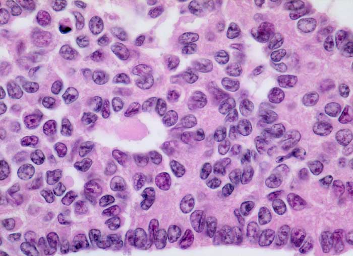 Hohlräume, die eosinophiles Material enthalten (=Call Exner body). Die Tumorzellen zeigen rundliche bis ovale Kerne mit gelegentlichen
