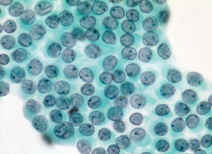 Feinnadelpunktion Schilddrüse: Tumorzellverband ohne Kolloid. Typische Kernmorphologie: helle Kerne mit betonter Kernmembran, feiner Nukleolus, zahlreiche