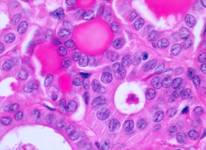 In diesem Ausschnitt zeigt der Tumor eine follikuläre Differenzierung. Die Tumorzellen zeigen die typische Morphologie eines papillären Karzinoms mit Kernkerben und aufgehelltem Kernchromatin.