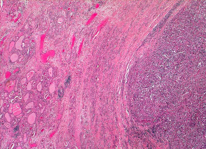 Tumorknoten liegt eine dicke bindegewebige Kapsel. Bereits in dieser Vergrösserung ist erkennbar, dass der Tumor weder follikuläre noch papilläre Strukturen enthält.