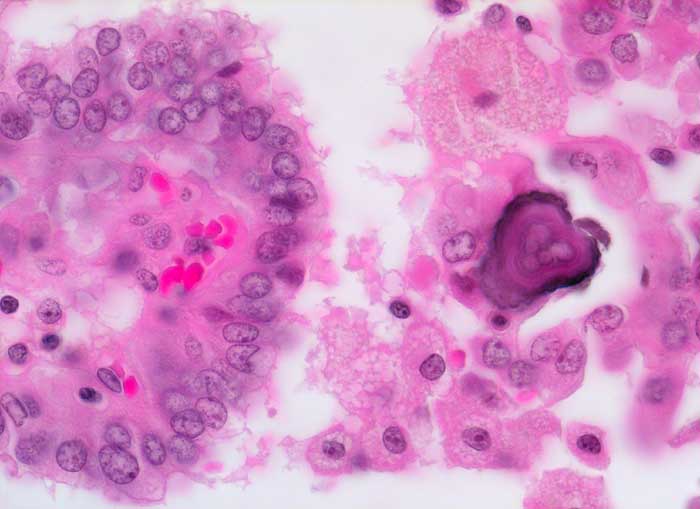 Psammomkörperchen umgeben von Schaumzellen. Links eine Papille mit fibrovaskulärem Stromastiel. Die Tumorzellen zeigen helle Milchglaskerne mit akzentuierter Kernmembran und einem feinen Nukleolus.