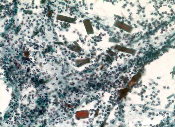 Feinnadelpunktion Parotis: massenhaft neutrophile Granulozyten und mehrere rechteckige eosinophile, nicht doppelbrechende Amylasekristalle