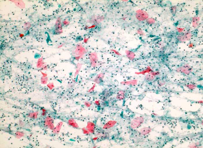 Feinnadelpunktion Hals: Plattenepithelien mit breitem eosinophilem Zytoplasma und kleinen Kernen auf entzündlichem Hintergrund.