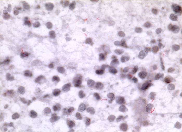 Zytologische Diagnose: Ausgeprägte granulozytäre Entzündung. Keine Malignitätszeichen. Die Ziehl Neelsen Färbung wurde über einem vorher mit Papanicolaou gefärbten Präparat hergestellt. Während bei immunkompetenten Patienten der Halslymphknotenbefall meist auf einen Primärinfekt im Bereich der Mundhöhle (Typ Bovinus) hindeutet, sind bei HIV Patienten die Lymphknoten wahrscheinlich im Rahmen einer generalisierten hämatogenen und lymphogenen Tuberkulose befallen (Miliartuberkulose).