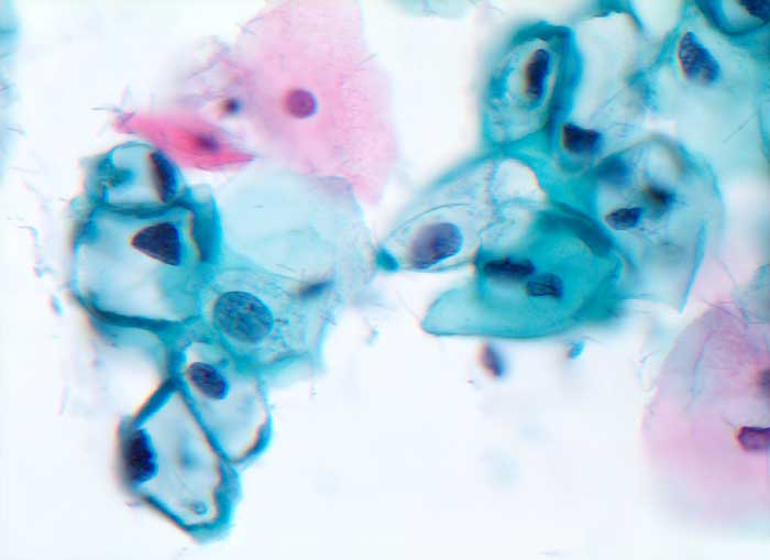 Portioabstrich: Zytopathischer Effekt des HPV Virus: Hyperchromasie und unregelmässige Kernmembranen (koilozytäre Dysplasie). Hier besonders deutlich sichtbarer perinukleärer Halo und peripher verdichteter Zytoplasmasaum.