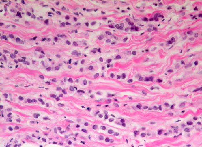 Zwischen breiten Bindegewebssträngen liegen die monomorphen kleinen Tumorzellen angeordnet in einreihigen Zellsträngen