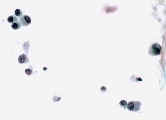 Mamma, Feinnadelpunktion: einzeln und in kleinen Verbänden liegende atypische Zellen mit exzentrisch im Zytoplasma liegenden, nicht sehr grossen und ziemlich uniformen hyperchromatischen Kernen. Nukleolen treten nicht hervor und keine Nacktkerne.
