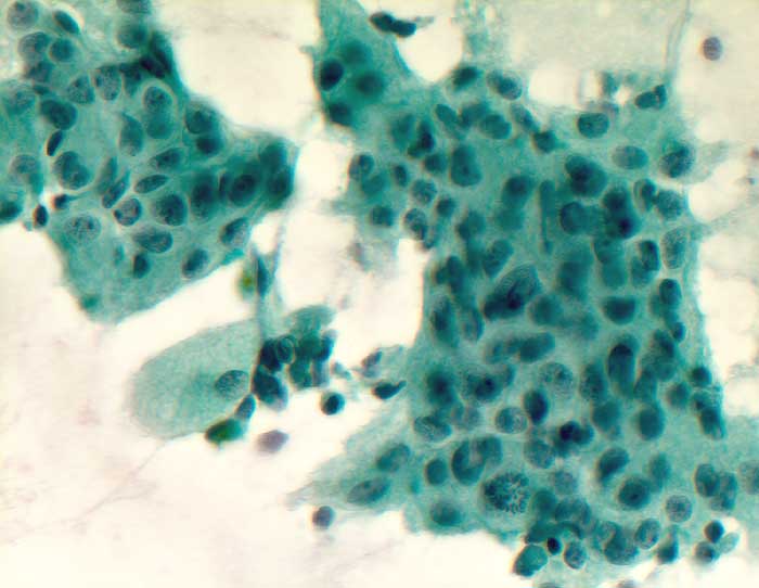 Prostata, Feinnadelpunktion: In lockeren Verbänden liegende atypische kubische Zellen. Diese besitzen relativ grosse, leicht bis mässig polymorphe, vermehrt grob strukturierte Kerne mit grossen Nukleolen. Im grösseren Zellverband ist eine Mitose erkennbar.