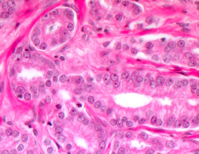Von einem einreihigen Epithel ausgekleidete Tumordrüsen mit fehlender Basalzellschicht. Auffallend grosse Nukleolen.