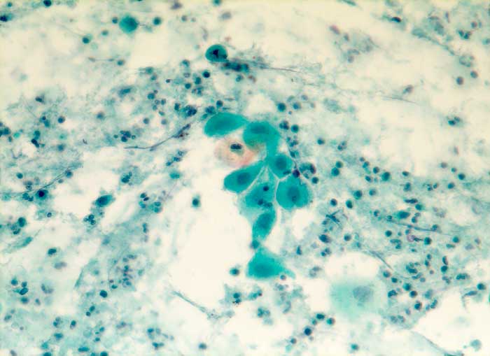 Zytologische Diagnose: Atrophische Kolpitis. Im vorliegenden zytologischen Ausstrichmaterial keine Hinweise auf Dysplasie. Wir empfehlen aber sicherheitshalber eine Kontrolle nach hormonellem Aufbau.