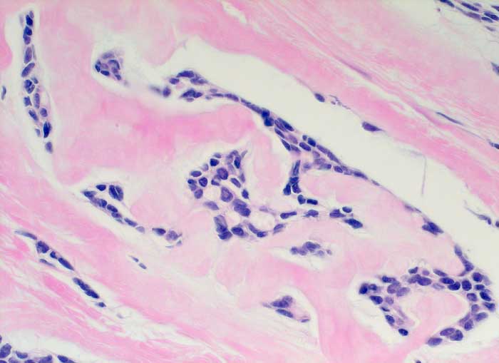 Dichtes amyloidartiges Stroma umschliesst residuelle zylindromatöse Knoten.