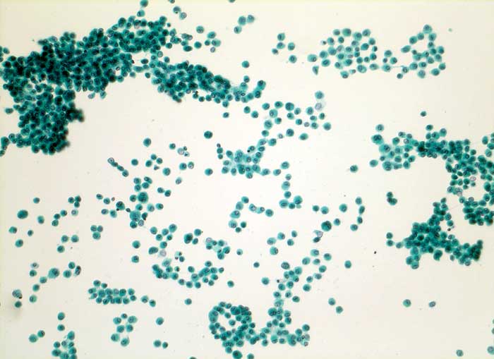 Bronchoalveoläre Lavage: Normalbefund einer BAL mit reichlich Alveolarmakrophagen auf sauberem Hintergrund. Nur vereinzelte Lymphozyten.