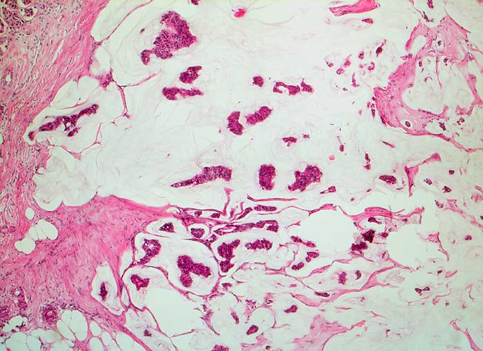 Schleimseen mit inselförmigen Tumorzellverbänden umgeben von Bindegewebssepten.
