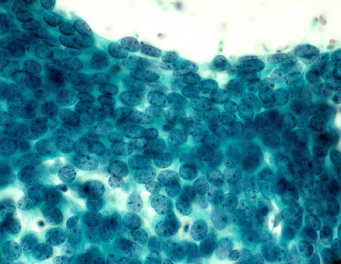 Feinnadelpunktion Mamma: Verband aus atypischen Zellen. Die Kerne sind vergrössert und enthalten ein grob gekörntes, hyperchromatisches Chromatin. Zytoplasma schmal bis mittelbreit, unscharf begrenzt. Angedeutetes nuclear crowding. Am Rand des Zellverbandes sind bipolare Myoepithelien erkennbar.