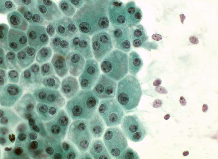 Feinnadelpunktion Mamma: zweidimensionaler Verband polygonaler, scharf begrenzter onkozytärer Zellen mit breitem, teils fein eosinophil granuliertem Zytoplasma. Zahlreiche zweikernige Zellen. Die Kerne sind rund, grob strukturiert und enthalten einen oder mehrere grosse Nukleolen. Der Zellverband wird begleitet von bipolaren Myoepithelien.