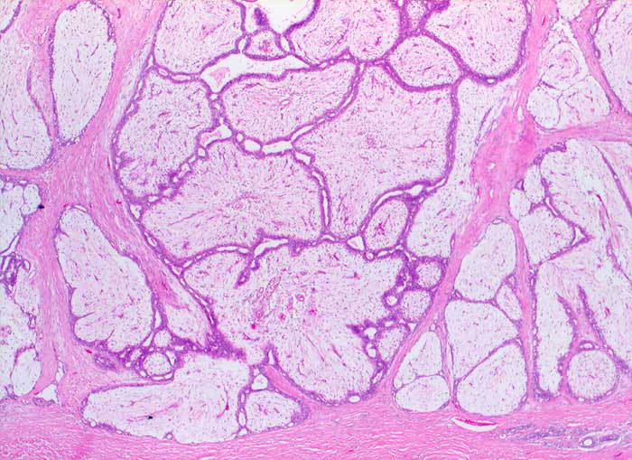 Biphasischer scharf begrenzter lobulierter Tumor bestehend aus verzweigten epithelial ausgekleideten Gangstrukturen, die von einem zellarmen ödematösen Stroma komprimiert werden.